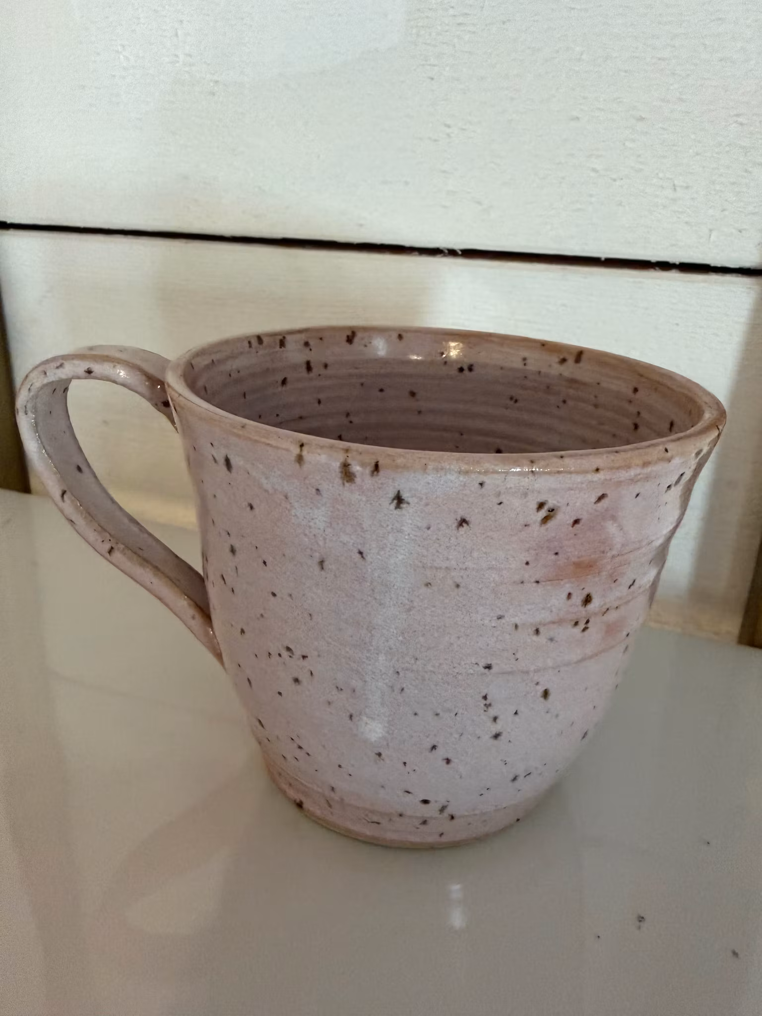 Drejad av mina händer i vit stengodslera med lavaprickar och glaserad i blank rosa glasyr.